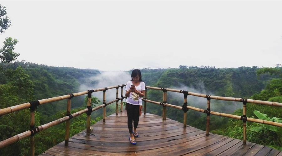 Standing on the bridge made of wood and bamboo must have the guts. Because it will feel like flying high with a barrier that is not only as high as an adult's knee.
